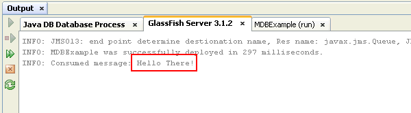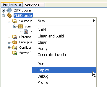 Right-click on the MDBExample project and select Deploy to deploy the MDB to GlassFish.