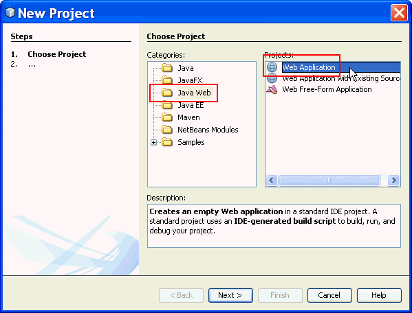 From the New Project dialog, select Java Web as the Category and Web Application as the Project. Click Next.