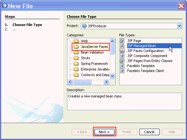 Choose JavaServer Faces from Categories and JSF Managed Bean from File Types. Click Next.