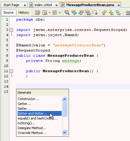 Use the NetBeans Insert Code feature to add a getter and setter for the field. Click in the MessageProducerBean file just above the last closing brace and press the Alt-Insert key, and select Getter and Setter from the Generate list.