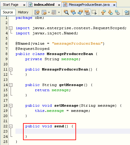 Open the MessageProducerBean class in the Editor and click in the bottom of the file, just before the closing curly brace.