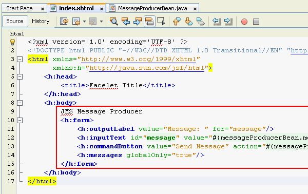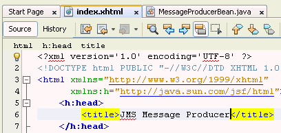 Change the title of the JSF page to JMS Message Producer. Save the file.