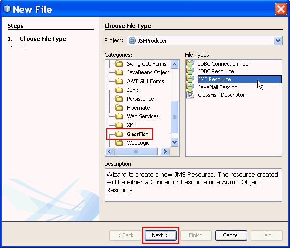 Choose GlassFish from Categories and JMS Resource from File Types.