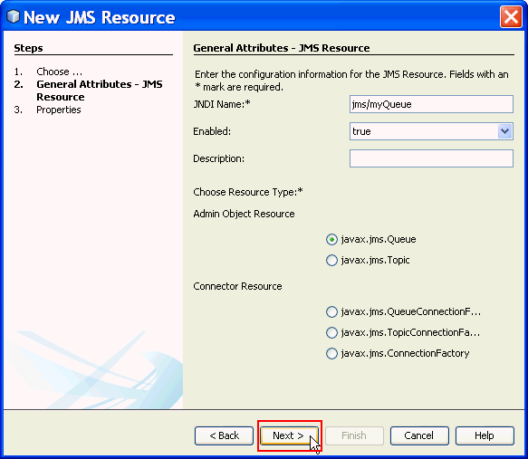 Accept the default JNDI name, jms/myQueue and the default Admin Object Resource. Click Next.