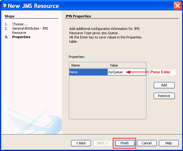 On the JMS Properties screen, enter myQueue in the value field and press the Enter key.