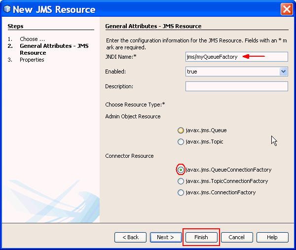 Select javax.jms.QueueConnectionFactory as the Connector Resource.