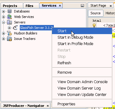 Note: If your instance of GlassFish already has a green triangle beside the fish icon, the server is already started and the Start command will be greyed out.