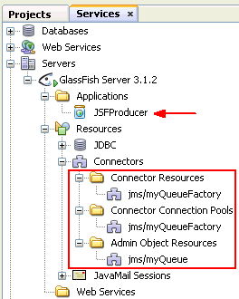 You will see that GlassFish has deployed your application, JSFProducer, created a Admin Object Resource, jms/myQueue, and a Connector Resource object, jms/myQueueFactory.