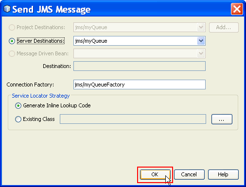 By default, NetBeans will choose your Admin Resource Object (jms/myQueue) as the Server Destination and jms/myQueueFactory as the Connection factory. Click OK.