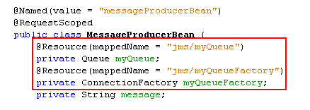 Scroll to the top of the file to see that NetBeans has added the proper resource declarations to your code for the Queue and ConnectionFactory instances.