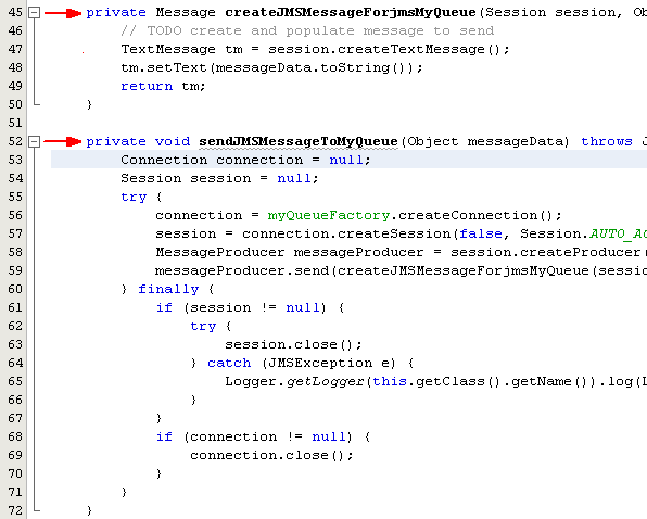 The sendJMSMessageToMyQueue creates a Connection using the ConnectionFactory, creates a Session from the connection, and a MessageProducer from the session.
