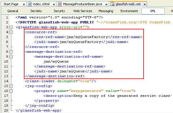 These warnings are a result of NetBeans attempting to create portable JNDI lookup references for the queue and connection factory you created. Because this example uses a non-portable mappedName lookup for the JMS resources, you can ignore the warnings, or remove the lines shown below from the glassfish-web.xml file.