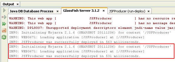 In the Output Window, in the GlassFish Server 3.1.2 tab, you will see that the application deployed successfully, however, the following warnings appear.