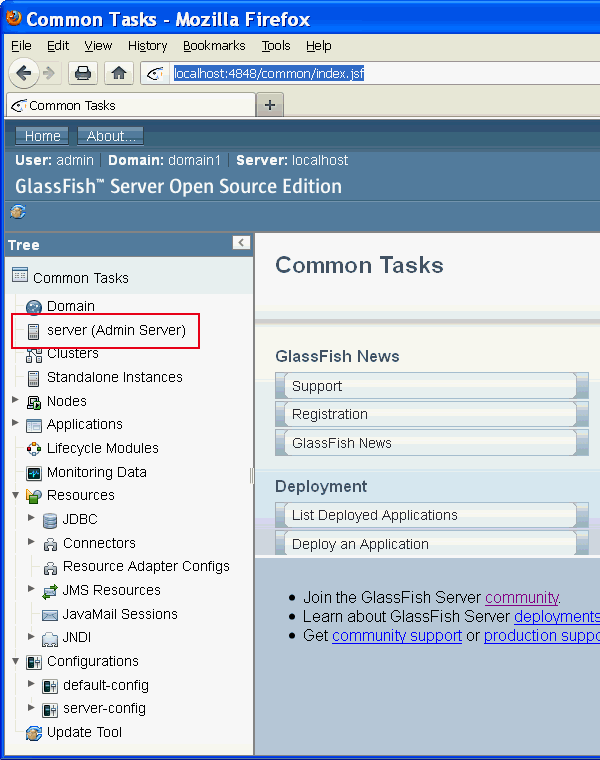 In a browser, start the GlassFish Admin Console by typing the following URL: