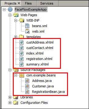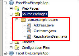 On the Projects tab, expand FaceFlowExampleApp > Source Packages > com.example.beans.