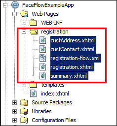 On the Projects tab in NetBeans, expand the FaceFlowExampleApp project and review the project directory structure.