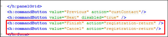 For the Finish and Cancel buttons, modify the value of the action attributes to registration-return.