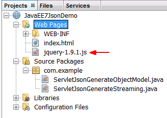 c. In the Projects window, under JavaEE7JsonDemo, right-click Web Pages, and select Paste. The jquery-1.9.1.js file is copied to the Web Pages folder.