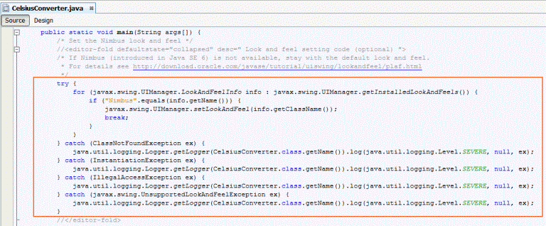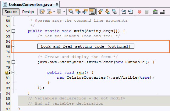 To see the look and feel code, expand the editor fold Look and Feel Setting Code(optional) in the main method and review the IDE generated look and feel.