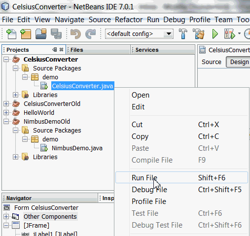 In the Projects pane, right-click CelsiusConverter.java and choose Run File