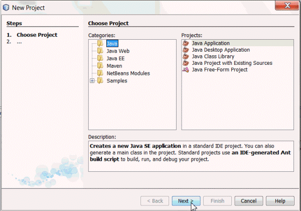 Select Java from the Categories column and Java Application from the Projects column and then click Next.