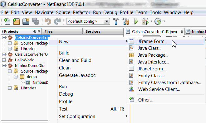 Right-click CelsiusConverter Project and select New > JFrame Form to add a JFrame.