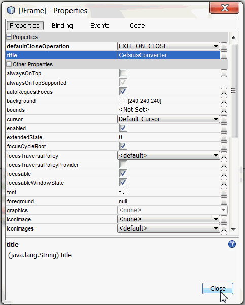 b. In the Property Editor, enter the value for the title property as “CelsuisConverter”.
