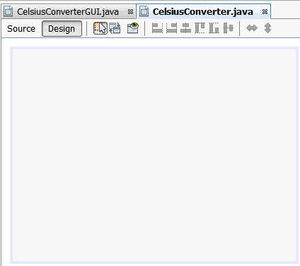 The JFrame opens in the Design area. The Design area is where you visually construct the GUI. It has two views: the Source view and the Design view. The Design view is the default. You can toggle between views by clicking the respective tabs.