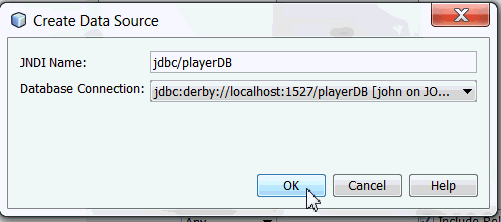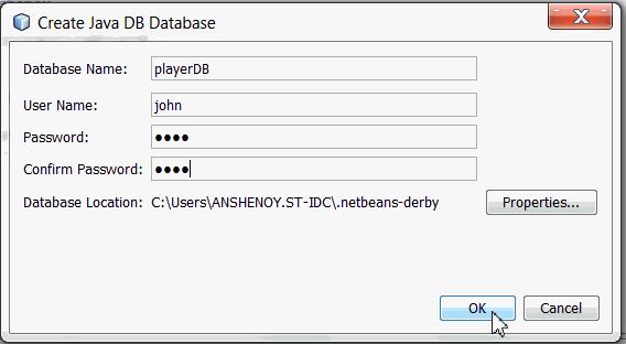 Java DB database server is part of NetBeans. We will use Java DB as the database server. The following steps demonstrate creating the database playerDB.
