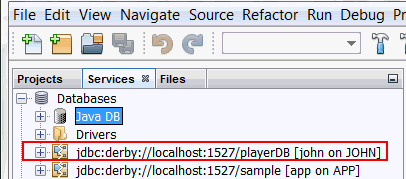 To connect to the newly created database playerDB, perform the following steps : a. Right-click jdbc:derby://localhost:1527/playerDB connection. b. Select Connect.