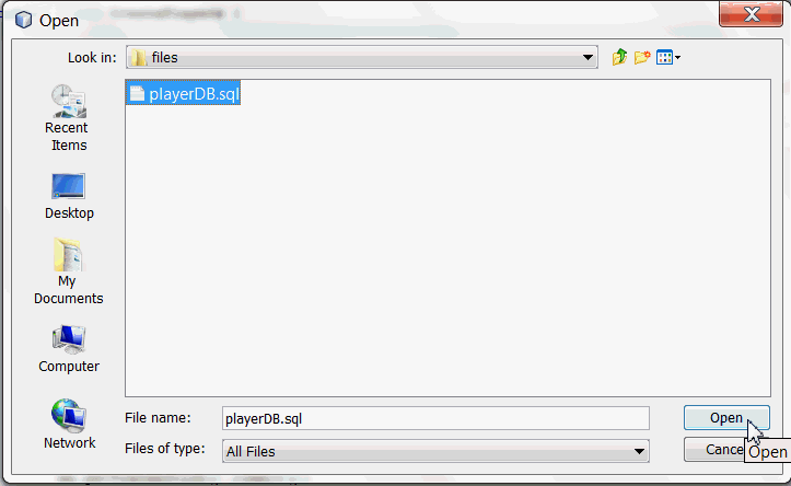Create tables and populate them with data in playerDB database. a. In NetBeans select File > Open File.