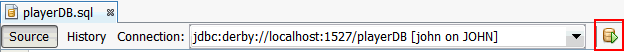d. Select jdbc:derby://localhost:1527/playerDB in Connection drop-down box in the SQL Editor toolbar. e. Click the Run SQL icon to execute the SQL statement.