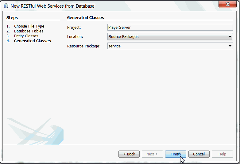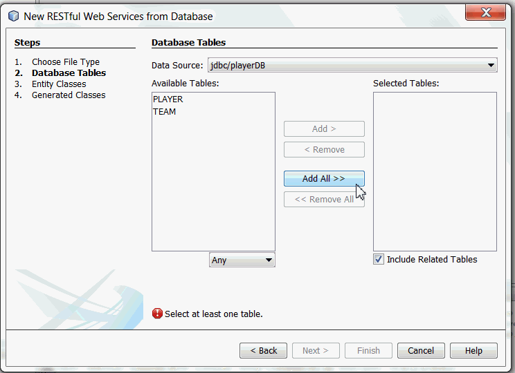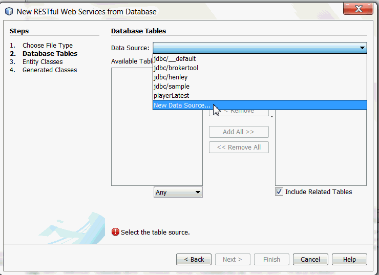To generate RESTful Web Services do the following: Right-click the PlayerServer and choose New > Other > Web Services > RESTful Web Services from Database. The New RESTful Web Service wizard opens on the Database Tables panel.