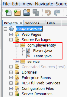e. Expand the RESTful Web Services folder and and verify the creation of two RESTful Web Services PlayerFacadeREST[com.playerentity.player] and TeamFacadeREST[com.playerentity.team].