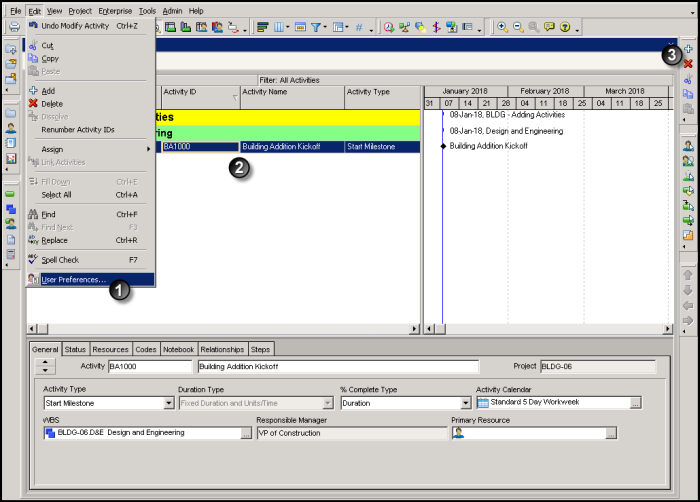 on the Edit toolbar to launch the New Activity wizard, which provides step-by-step guidance for adding activities to the project plan. The wizard, which must first be enabled in User Preferences, ensures that all necessary information is entered properly. Once you become more familiar with the information required for adding a new activity, you may prefer to forgo the use of the wizard and add activities manually.