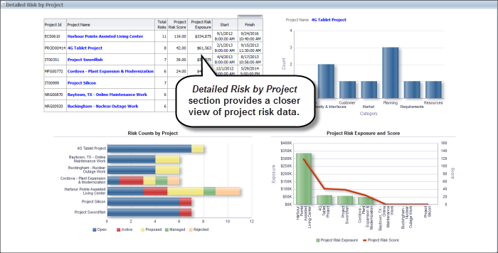 The Risk page of the Main sample dashboard has been enhanced with an update to one section and the addition of a new section. A new chart, Open vs. Total Risks, is added to the Detailed Risk by Location section, offering another summary view of risk by location data. The new section, Detailed Risk by Project, provides a table and multiple charts for more closely viewing and analyzing project risks. The table and charts all provide drill-down to more detailed data.