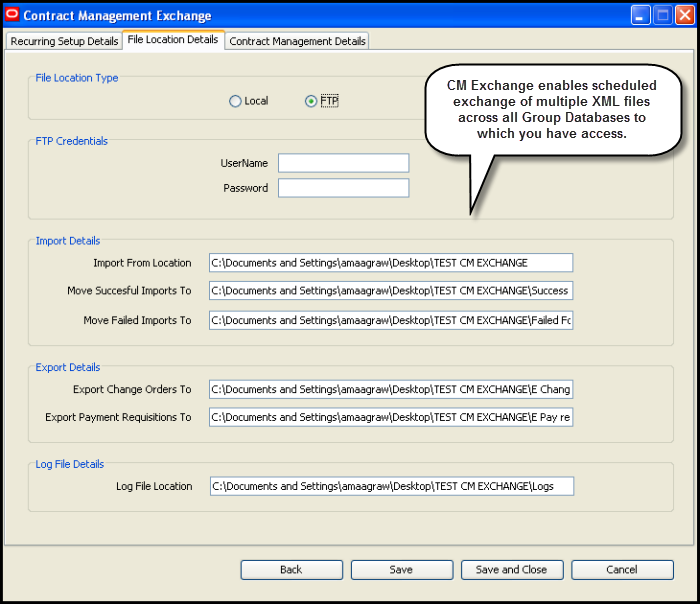 Contract Management Exchange now supports scheduled import/export of multiple XML files. The application provides setup tabs where you can enter an FTP location and specify the frequency for running the import/export. The import process supports the following information: