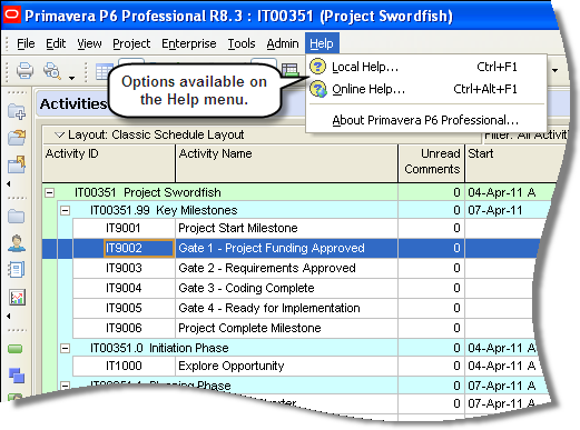 Choose Local Help to have the Help menu behave the same as Contents does in P6 Professional R8.2 and earlier. The HTML Help files are installed locally when P6 Professional is installed. Click Local Help to launch the local file. By default, the installation location is \\Oracle\Primavera P6\P6 Professional\Help.