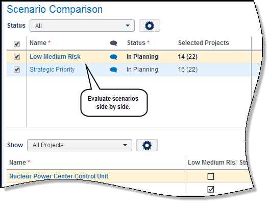 The Scenario Comparison page allows a capital planner to quickly view summary-level information about the scenarios without seeing all the details. Summary-level data includes earned value, budget values, KPIs and target budget. View scenarios side by side to analyze how values change with the selection of projects within each scenario or how KPIs are performing against the target budget.