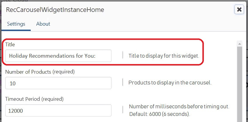 The following screen capture shows the option to set the title for a widget in Oracle Commerce Cloud.