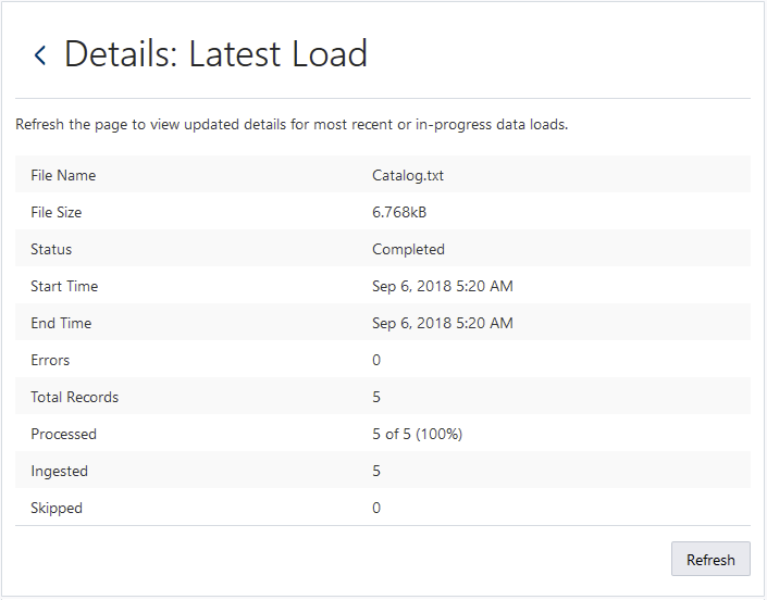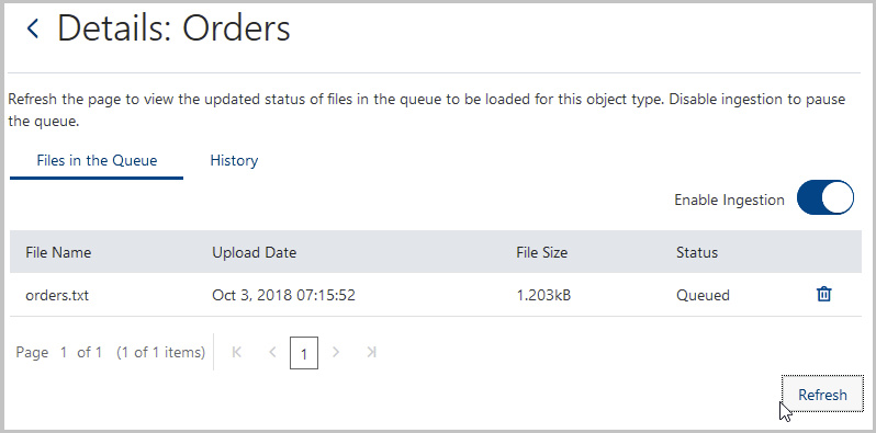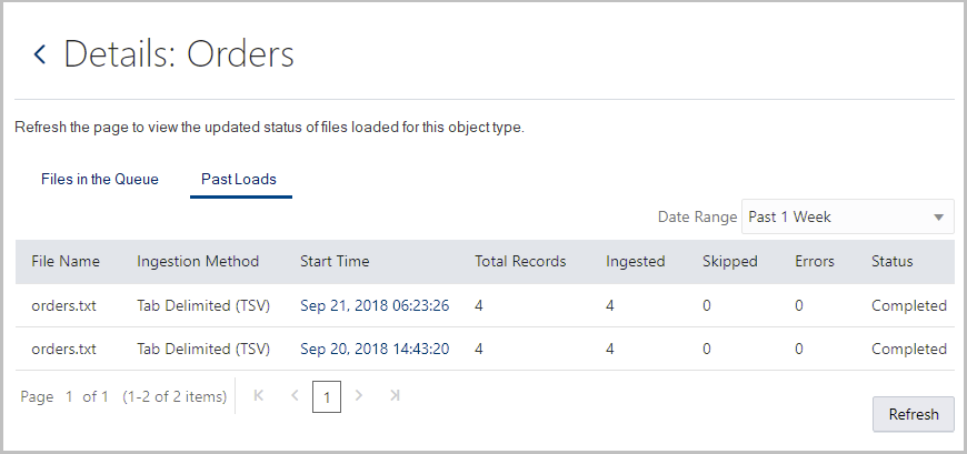 You can now view more details about historical activity on the Past Loads tab and manage the file ingestion queue. The Past Loads tab lists all files that started loading along with their details, such as status and the number of records ingested. The Files in Queue tab shows new options to disable the ingestion queue and delete unprocessed files.