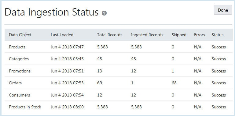 - On the Data Sources page for your connected commerce application, click View Status > Data Ingestion Status.
