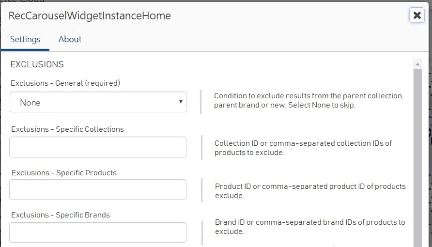 - To exclude products in one or more specific brands or collections, enter the ID or comma-separated IDs into the respective field.