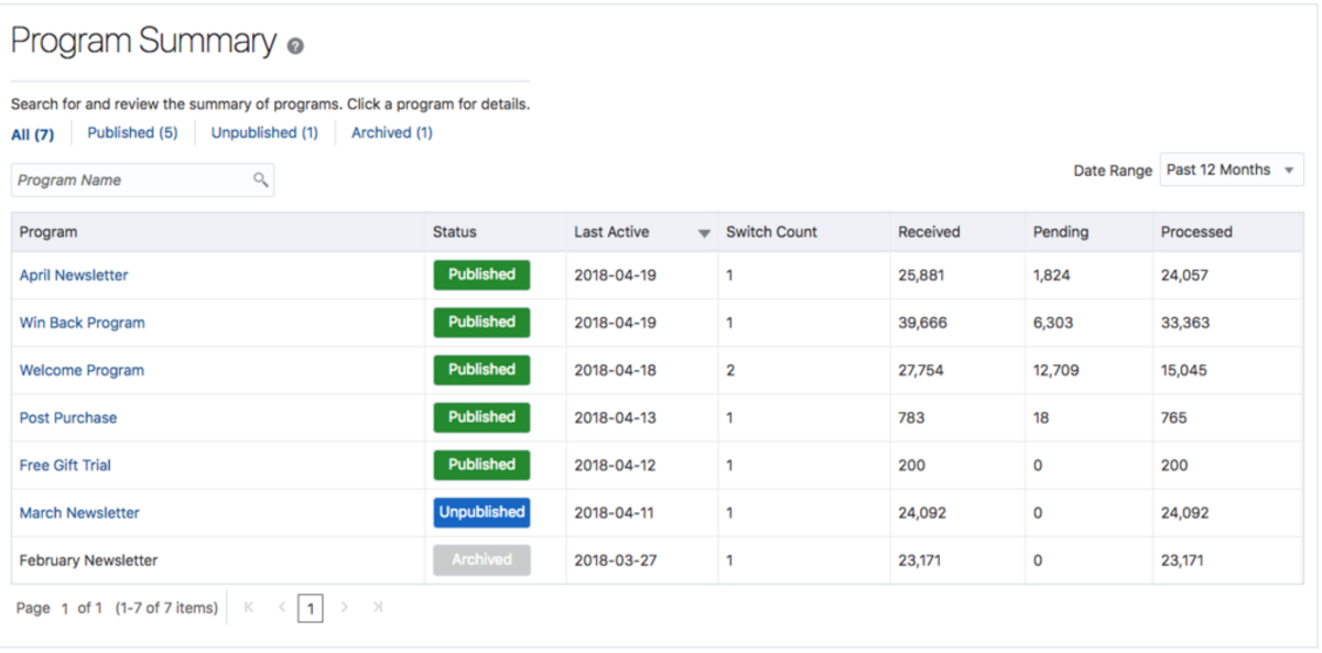 The following screen capture shows the program summary page in Oracle Adaptive Intelligent Apps for CX that lists all the programs along with their status: