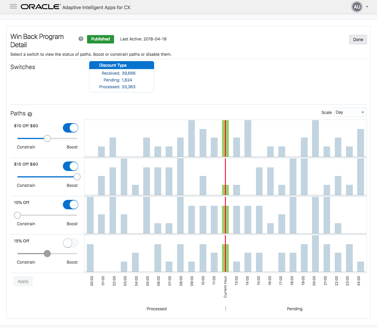 You can exert supervisory controls on program switches based on your organizational requirements. You can adjust the likelihood of consumers being routed on different paths of a program switch by boosting or constraining the paths. You can also choose to disable a path if you don’t want to route customers through that path at all.