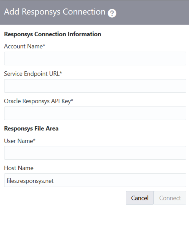 The following screen capture shows the connection dialog box with fields for Oracle Responsys connection information.