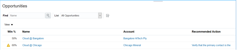 The following screen capture shows the adaptive intelligent win percentage warning icon on the Opportunities page.