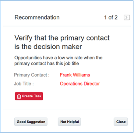 Use the feature to provide intelligent guidance on the best sales action to improve your sales representatives’ chances of winning an opportunity. Alert your sales representatives of a significant difference between the adaptive intelligent prediction and the current business forecast for an opportunity’s win probability. Your sales representatives can view opportunities with warning icons on the Opportunities page along with the recommended action, and take the best sales action.