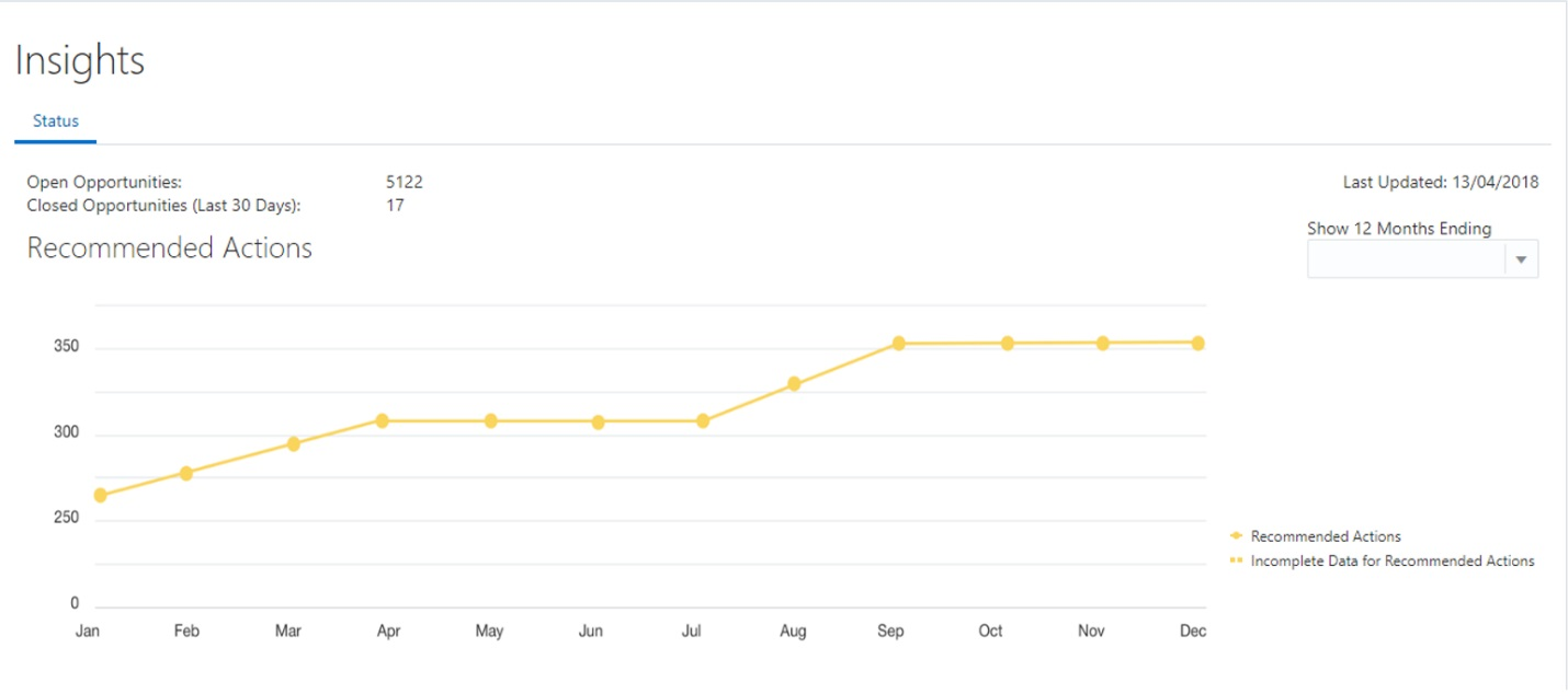 The following screen capture shows the Insights page with the open opportunities and closed opportunities in the last 30 days, along with the graph for recommended actions.