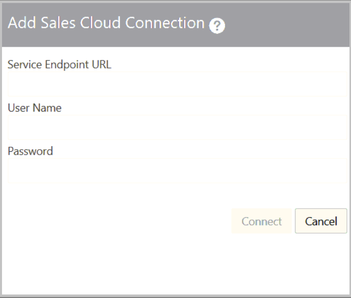 The following screen capture shows the connection dialog box with fields for Oracle Sales Cloud connection information.